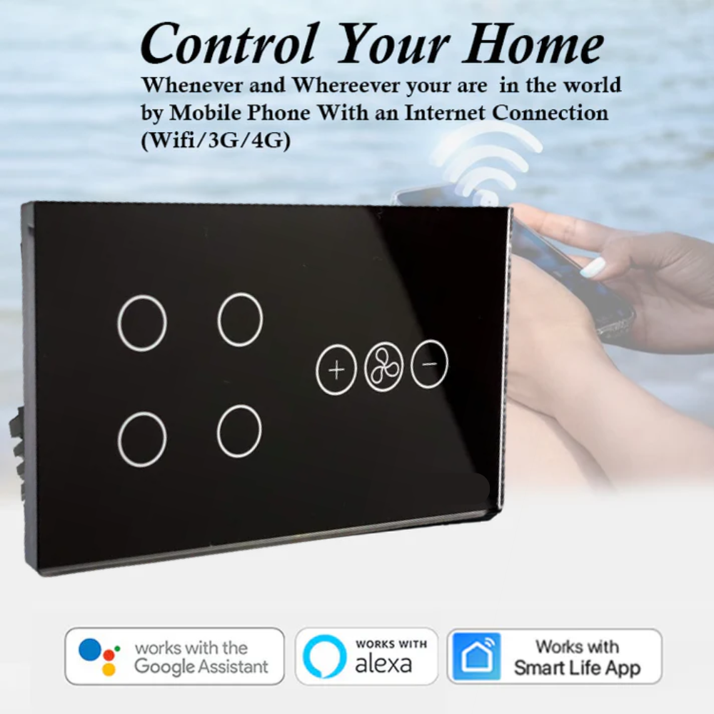The 4 Gang Smart Switch with Fan Dimmer is the ultimate upgrade for modern homes. Designed with a premium black glass panel, this switch lets you control up to 4 lights and 1 fan from a single, elegant touch interface. Whether you’re upgrading your bedroom, living room, or office, this smart wall switch blends luxury with functionality.