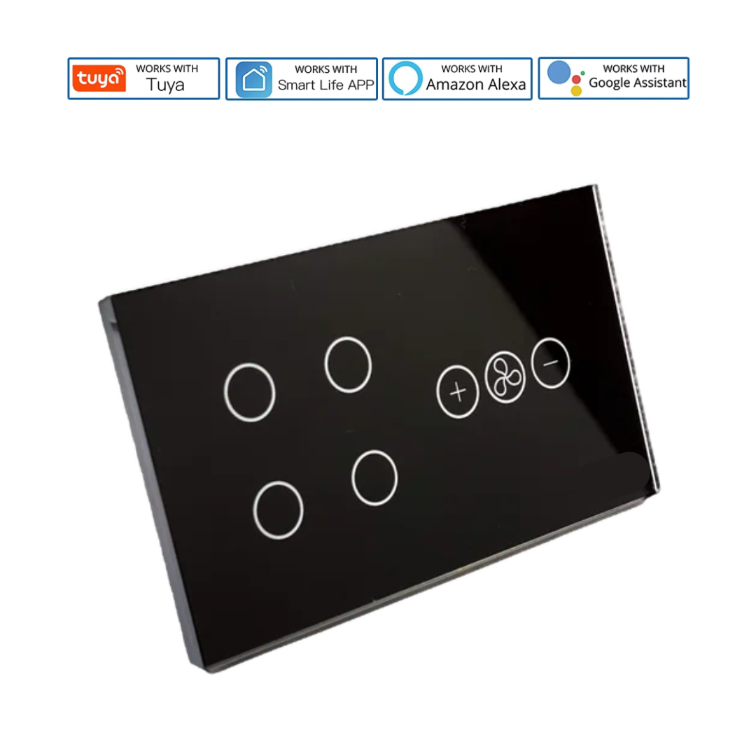 4 Gang Smart Switch with Fan Dimmer – Black Glass Panel