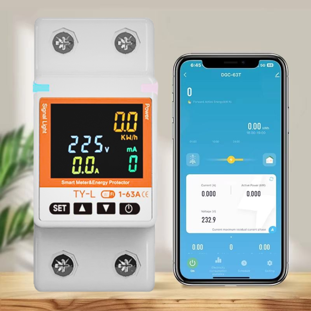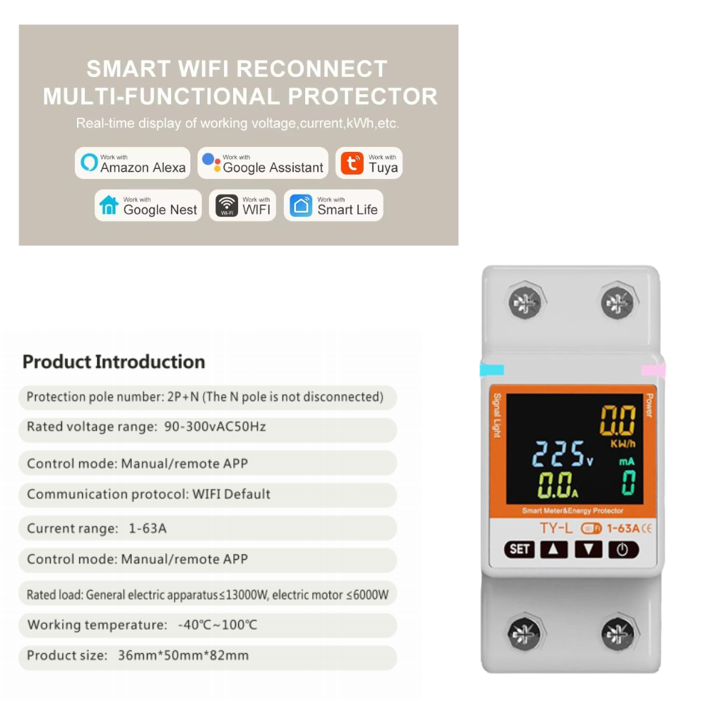 Designed for safe operation under harsh electrical conditions, this breaker supports Tuya/Smart Life apps on Android and iOS and works with voice assistants. Built to safely handle up to 63A while ensuring smart automation.